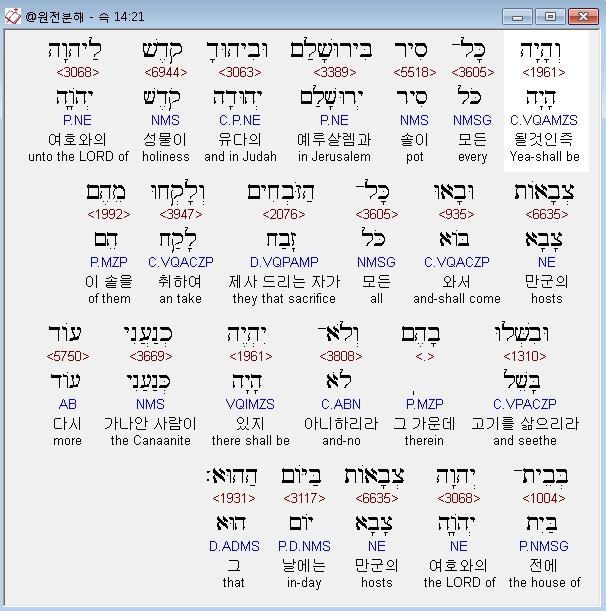 히브리어구약BHS,21 וְהָיָה כָּל־סִיר בִּירוּשָׁלִַם וּבִיהוּדָה קֹדֶשׁ לַיהוָה צְבָאֹות וּבָאוּ כָּל־הַזֹּבְחִים וְלָקְחוּ מֵהֶם וּבִשְּׁלוּ בָהֶם וְלֹא־יִהְיֶה כְנַעֲנִי עֹוד בְּבֵית־יְהוָה צְבָאֹות בַּיֹּום הַהוּא׃