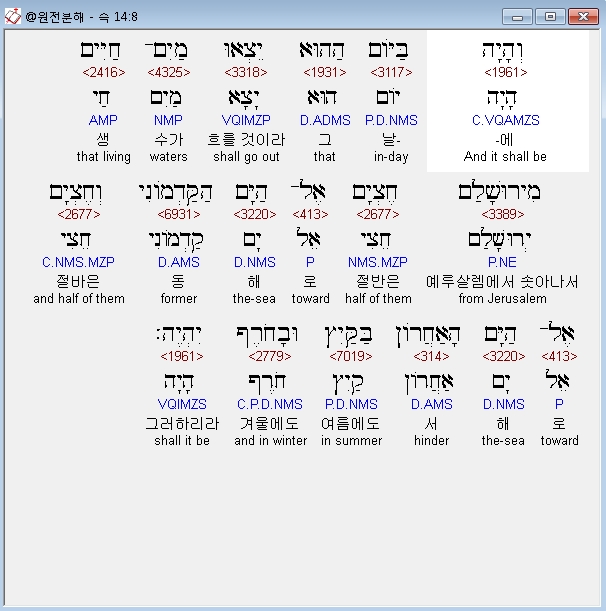 개역개정,8 그 날에 생수가 예루살렘에서 솟아나서 절반은 동해로, 절반은 서해로 흐를 것이라 여름에도 겨울에도 그러하리라