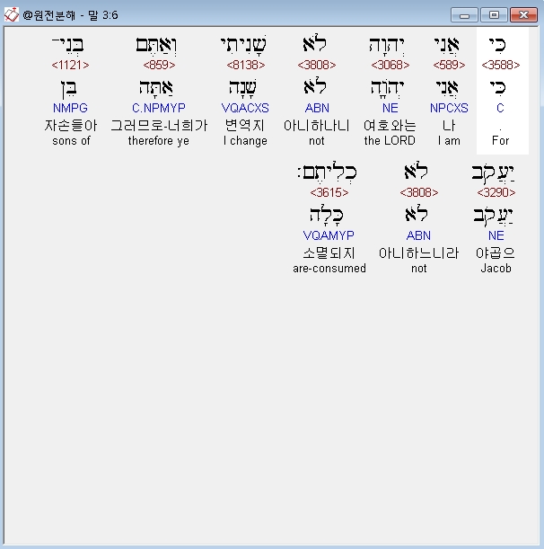 히브리어구약BHS,6 כִּי אֲנִי יְהוָה לֹא שָׁנִיתִי וְאַתֶּם בְּנֵי־יַעֲקֹב לֹא כְלִיתֶם׃