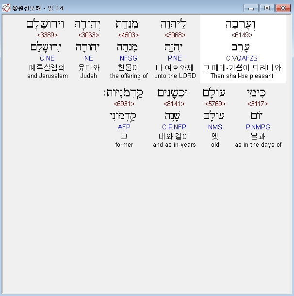 히브리어구약BHS,4 וְעָרְבָה לַיהוָה מִנְחַת יְהוּדָה וִירוּשָׁלִָם כִּימֵי עֹולָם וּכְשָׁנִים קַדְמֹנִיֹּות׃