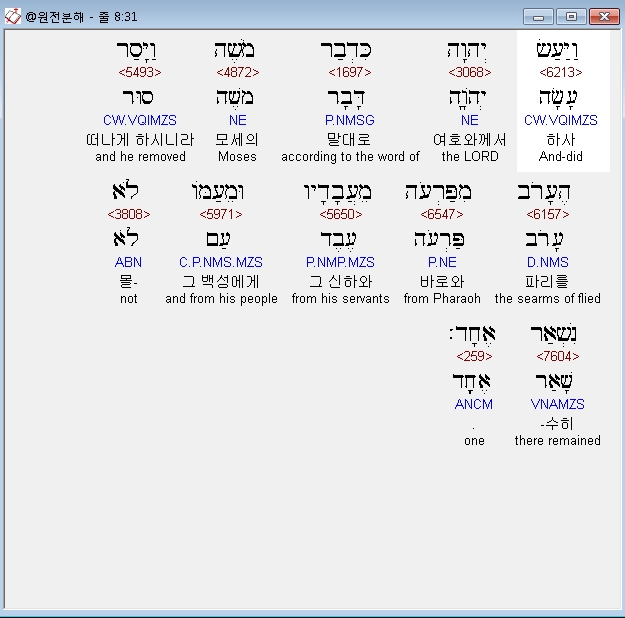 히브리어구약BHS,31 וַיַּעַשׂ יְהוָה כִּדְבַר מֹשֶׁה וַיָּסַר הֶעָרֹב מִפַּרְעֹה מֵעֲבָדָיו וּמֵעַמֹּו לֹא נִשְׁאַר אֶחָד׃