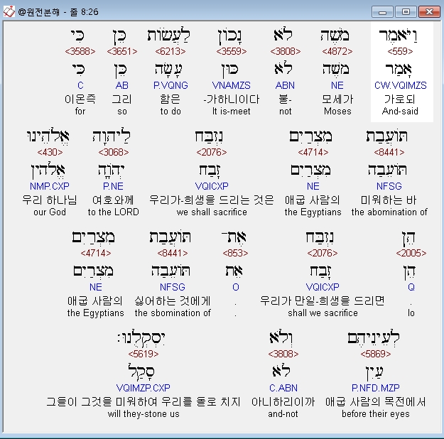 히브리어구약BHS,26 וַיֹּאמֶר מֹשֶׁה לֹא נָכֹון לַעֲשֹׂות כֵּן כִּי תֹּועֲבַת מִצְרַיִם נִזְבַּח לַיהוָה אֱלֹהֵינוּ הֵן נִזְבַּח אֶת־תֹּועֲבַת מִצְרַיִם לְעֵינֵיהֶם וְלֹא יִסְקְלֻנוּ׃