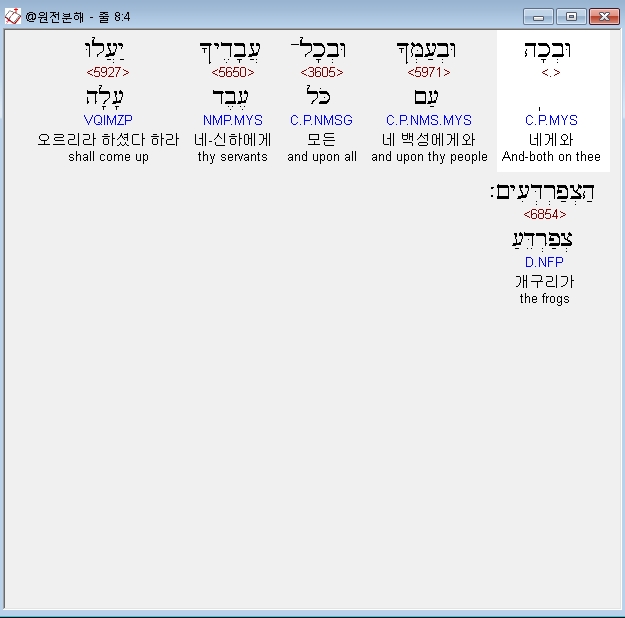 히브리어구약BHS,4 וּבְכָה וּבְעַמְּךָ וּבְכָל־עֲבָדֶיךָ יַעֲלוּ הַצְפַרְדְּעִים׃