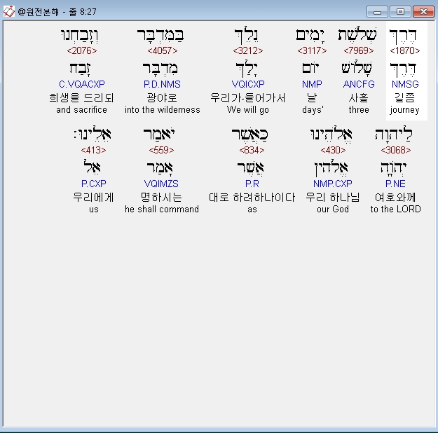 히브리어구약BHS,27 דֶּרֶךְ שְׁלֹשֶׁת יָמִים נֵלֵךְ בַּמִּדְבָּר וְזָבַחְנוּ לַיהוָה אֱלֹהֵינוּ כַּאֲשֶׁר יֹאמַר אֵלֵינוּ׃