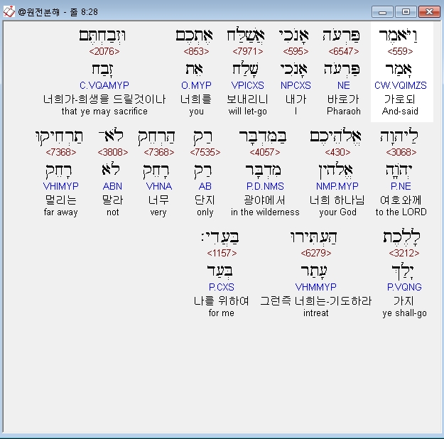 히브리어구약BHS,28 וַיֹּאמֶר פַּרְעֹה אָנֹכִי אֲשַׁלַּח אֶתְכֶם וּזְבַחְתֶּם לַיהוָה אֱלֹהֵיכֶם בַּמִּדְבָּר רַק הַרְחֵק לֹא־תַרְחִיקוּ לָלֶכֶת הַעְתִּירוּ בַּעֲדִי׃