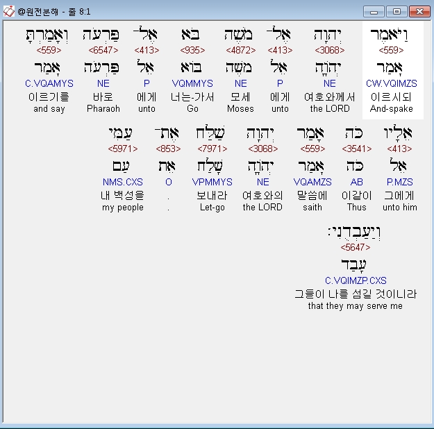 히브리어구약BHS,1 וַיֹּאמֶר יְהוָה אֶל־מֹשֶׁה בֹּא אֶל־פַּרְעֹה וְאָמַרְתָּ אֵלָיו כֹּה אָמַר יְהוָה שַׁלַּח אֶת־עַמִּי וְיַעַבְדֻנִי׃