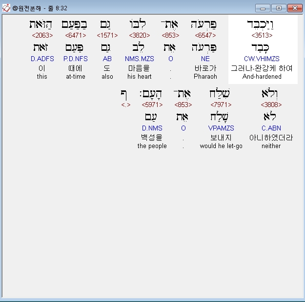 히브리어구약BHS,32 וַיַּכְבֵּד פַּרְעֹה אֶת־לִבֹּו גַּם בַּפַּעַם הַזֹּאת וְלֹא שִׁלַּח אֶת־הָעָם׃ ף