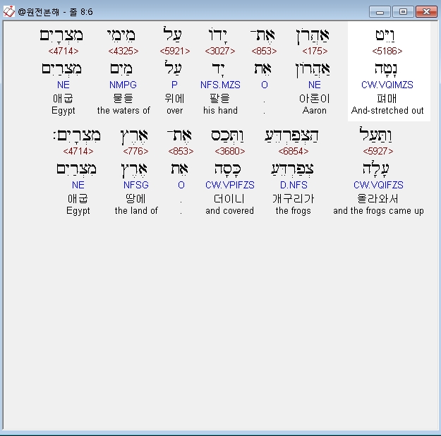 히브리어구약BHS,6 וַיֵּט אַהֲרֹן אֶת־יָדֹו עַל מֵימֵי מִצְרָיִם וַתַּעַל הַצְּפַרְדֵּעַ וַתְּכַס אֶת־אֶרֶץ מִצְרָיִם׃