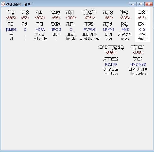 히브리어구약BHS,2 וְאִם־מָאֵן אַתָּה לְשַׁלֵּחַ הִנֵּה אָנֹכִי נֹגֵף אֶת־כָּל־גְּבוּלְךָ בַּצְפַרְדְּעִים׃