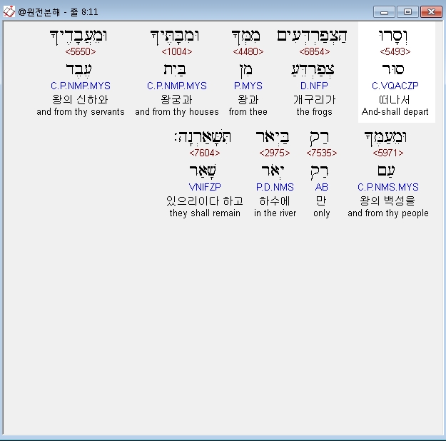 헬라어구약Septuagint,7 και περιαιρεθησονται οι βατραχοι απο σου και εκ των οικιων υμων και εκ των επαυλεων και απο των θεραποντων σου και απο του λαου σου πλην εν τω ποταμω υπολειφθησονται