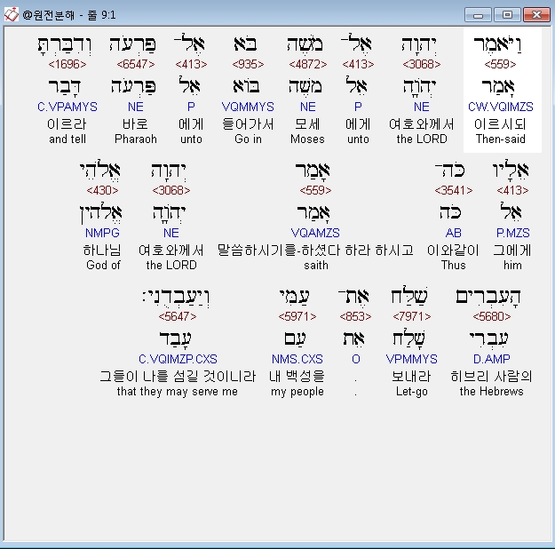 히브리어구약BHS,1 וַיֹּאמֶר יְהוָה אֶל־מֹשֶׁה בֹּא אֶל־פַּרְעֹה וְדִבַּרְתָּ אֵלָיו כֹּה־אָמַר יְהוָה אֱלֹהֵי הָעִבְרִים שַׁלַּח אֶת־עַמִּי וְיַעַבְדֻנִי׃