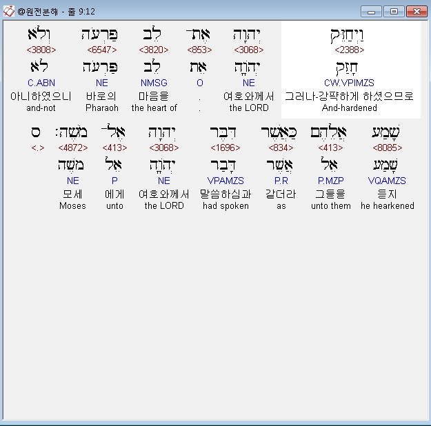 히브리어구약BHS,35 וַיֶּחֱזַק לֵב פַּרְעֹה וְלֹא שִׁלַּח אֶת־בְּנֵי יִשְׂרָאֵל כַּאֲשֶׁר דִּבֶּר יְהוָה בְּיַד־מֹשֶׁה׃ ף