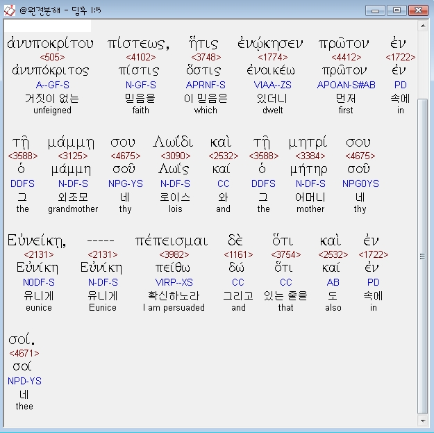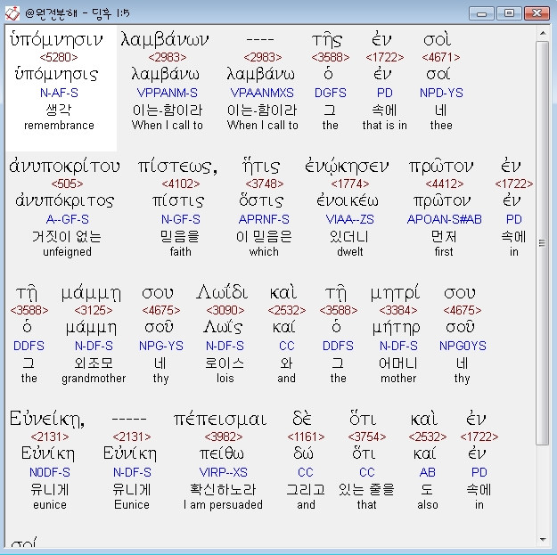 헬라어신약Stephanos,5 υπομνησιν λαμβανων της εν σοι ανυποκριτου πιστεως ητις ενωκησεν πρωτον εν τη μαμμη σου λωιδι και τη μητρι σου ευνεικη πεπεισμαι δε οτι και εν σοι