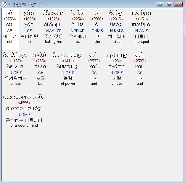 우 가르 에도켄 헤민 호 데오스 프뉴마 데일라스 알라 뒤나메오스 카이 아가페스 카이 소프로니스무