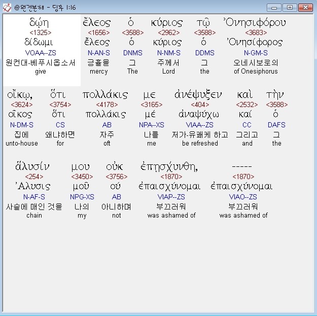 헬라어신약Stephanos,16 δωη ελεος ο κυριος τω ονησιφορου οικω οτι πολλακις με ανεψυξεν και την αλυσιν μου ουκ επησχυνθη