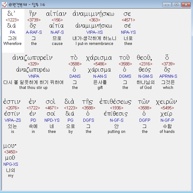 헬라어신약Stephanos,6 δι ην αιτιαν αναμιμνησκω σε αναζωπυρειν το χαρισμα του θεου ο εστιν εν σοι δια της επιθεσεως των χειρων μου