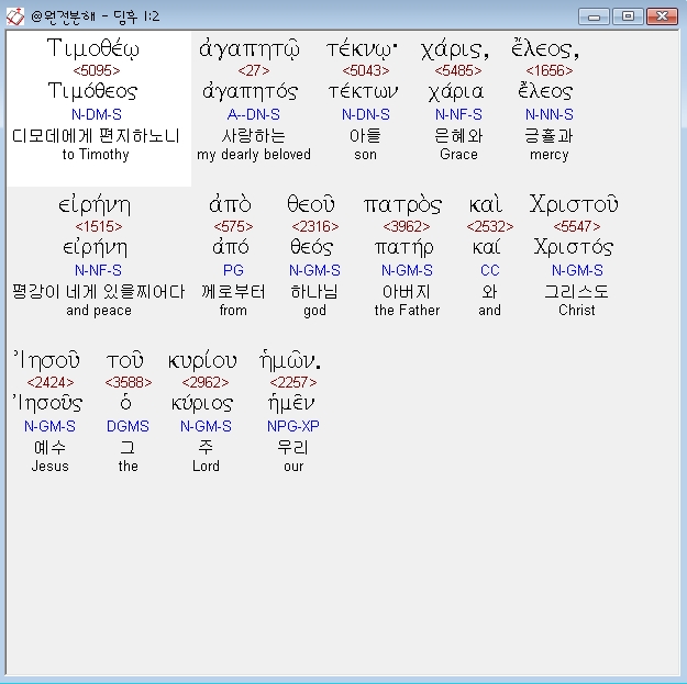 헬라어신약Stephanos,2 τιμοθεω αγαπητω τεκνω χαρις ελεος ειρηνη απο θεου πατρος και χριστου ιησου του κυριου ημων