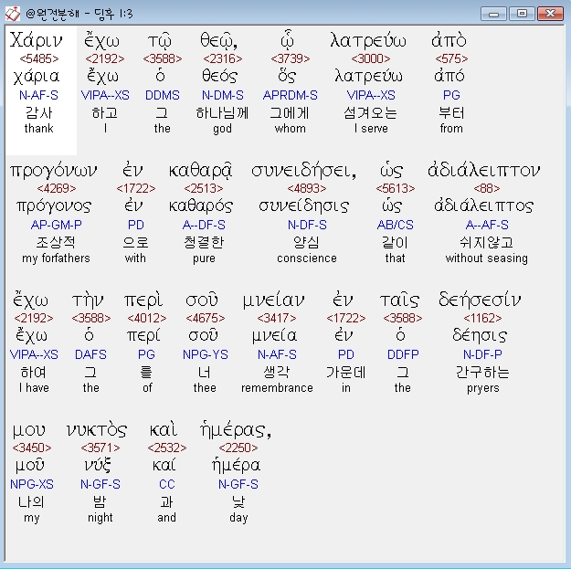 헬라어신약Stephanos,3 χαριν εχω τω θεω ω λατρευω απο προγονων εν καθαρα συνειδησει ως αδιαλειπτον εχω την περι σου μνειαν εν ταις δεησεσιν μου νυκτος και ημερας