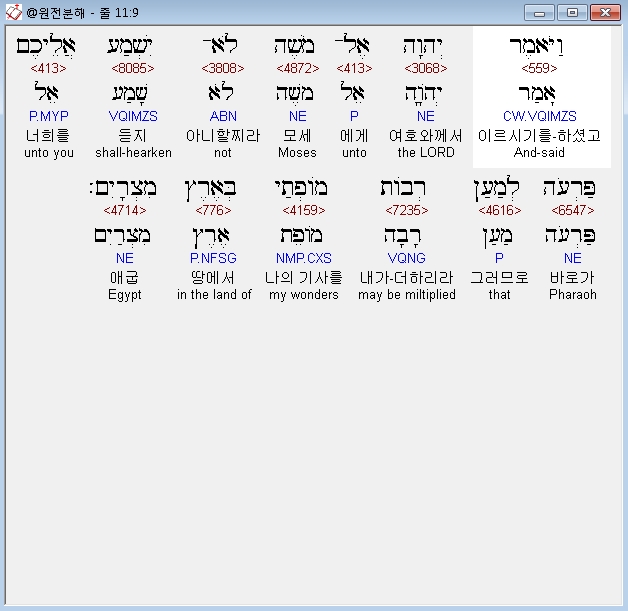 히브리어구약BHS,9 וַיֹּאמֶר יְהוָה אֶל־מֹשֶׁה לֹא־יִשְׁמַע אֲלֵיכֶם פַּרְעֹה לְמַעַן רְבֹות מֹופְתַי בְּאֶרֶץ מִצְרָיִם׃