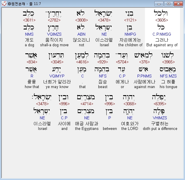 헬라어구약Septuagint,7 και εν πασι τοις υιοις ισραηλ ου γρυξει κυων τη γλωσση αυτου απο ανθρωπου εως κτηνους οπως ειδης οσα παραδοξασει κυριος ανα μεσον των αιγυπτιων και του ισραηλ