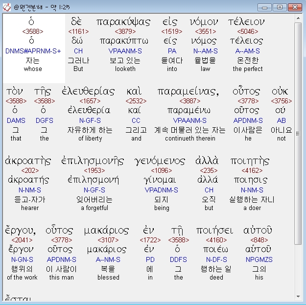 헬라어신약Stephanos,25 ο δε παρακυψας εις νομον τελειον τον της ελευθεριας και παραμεινας ουτος ουκ ακροατης επιλησμονης γενομενος αλλα ποιητης εργου ουτος μακαριος εν τη ποιησει αυτου εσται