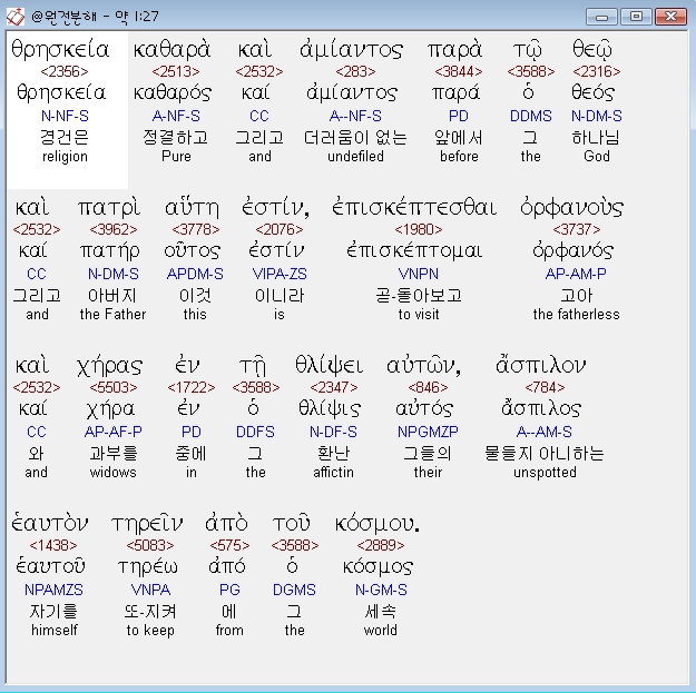 헬라어신약Stephanos,27 θρησκεια καθαρα και αμιαντος παρα τω θεω και πατρι αυτη εστιν επισκεπτεσθαι ορφανους και χηρας εν τη θλιψει αυτων ασπιλον εαυτον τηρειν απο του κοσμου