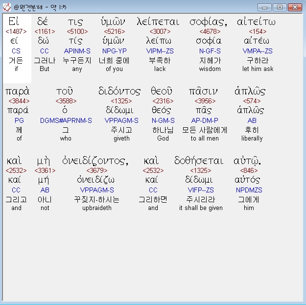 헬라어신약Stephanos,5 ει δε τις υμων λειπεται σοφιας αιτειτω παρα του διδοντος θεου πασιν απλως και μη ονειδιζοντος και δοθησεται αυτω