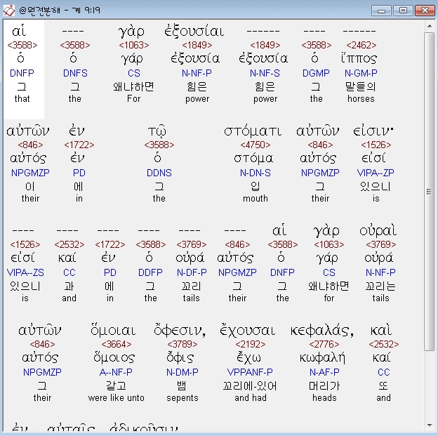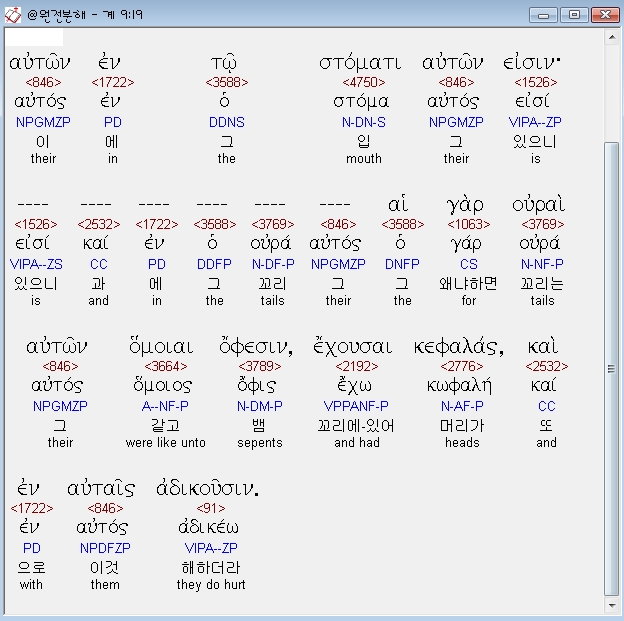 헬라어신약Stephanos,19 αι γαρ εξουσιαι αυτων εν τω στοματι αυτων εισιν αι γαρ ουραι αυτων ομοιαι οφεσιν εχουσαι κεφαλας και εν αυταις αδικουσιν