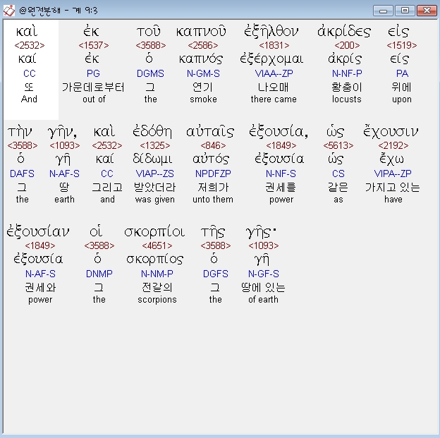 헬라어신약Stephanos,3 και εκ του καπνου εξηλθον ακριδες εις την γην και εδοθη αυταις εξουσια ως εχουσιν εξουσιαν οι σκορπιοι της γης