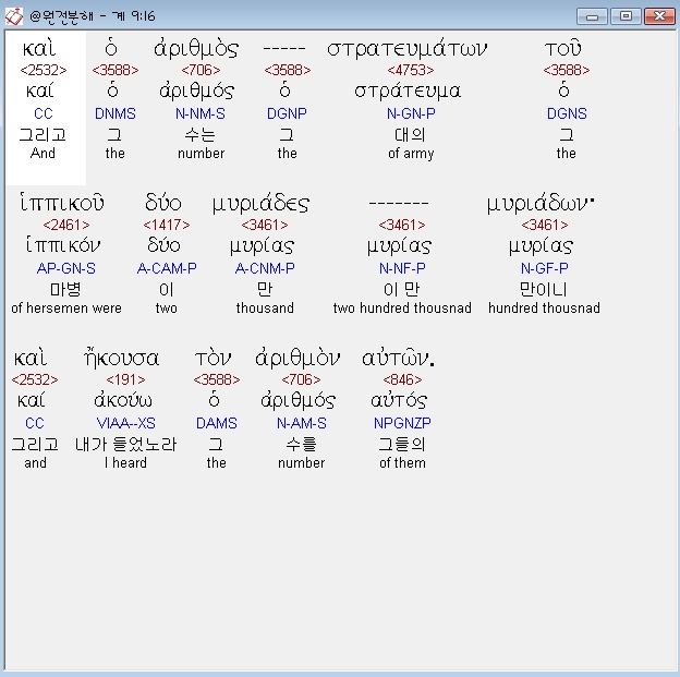 헬라어신약Stephanos,16 και ο αριθμος στρατευματων του ιππικου δυο μυριαδες μυριαδων και ηκουσα τον αριθμον αυτων