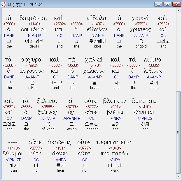 헬라어신약Stephanos,20 και οι λοιποι των ανθρωπων οι ουκ απεκτανθησαν εν ταις πληγαις ταυταις ουτε μετενοησαν εκ των εργων των χειρων αυτων ινα μη προσκυνησωσιν τα δαιμονια και ειδωλα τα χρυσα και τα αργυρα και τα χαλκα και τα λιθινα και τα ξυλινα α ουτε βλεπειν δυναται ουτε ακουειν ουτε περιπατειν