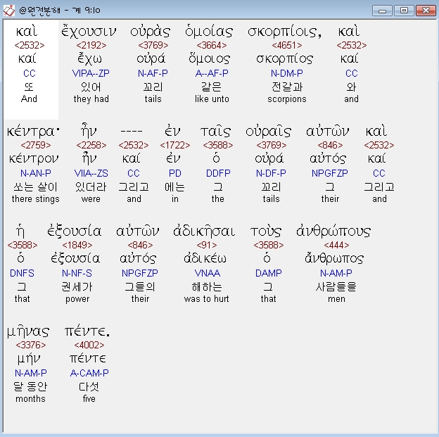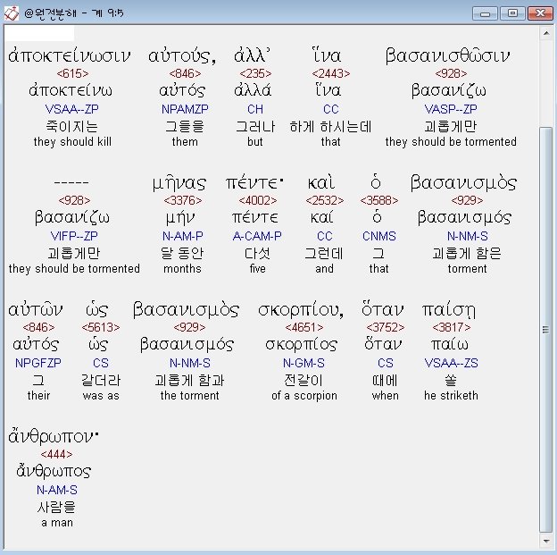 헬라어신약Stephanos,5 και εδοθη αυταις ινα μη αποκτεινωσιν αυτους αλλ ινα βασανισθωσιν μηνας πεντε και ο βασανισμος αυτων ως βασανισμος σκορπιου οταν παιση ανθρωπον