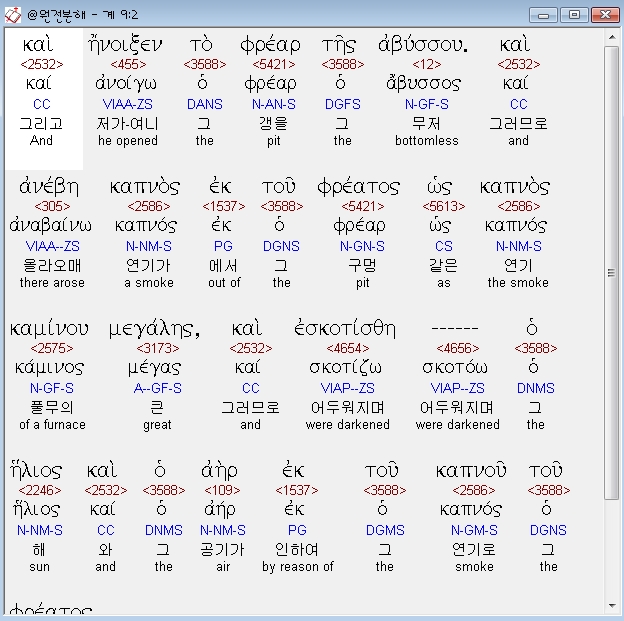 헬라어신약Stephanos,2 και ηνοιξεν το φρεαρ της αβυσσου και ανεβη καπνος εκ του φρεατος ως καπνος καμινου μεγαλης και εσκοτισθη ο ηλιος και ο αηρ εκ του καπνου του φρεατος
