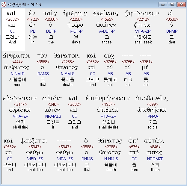 헬라어신약Stephanos,6 και εν ταις ημεραις εκειναις ζητησουσιν οι ανθρωποι τον θανατον και ουχ ευρησουσιν αυτον και επιθυμησουσιν αποθανειν και φευξεται ο θανατος απ αυτων