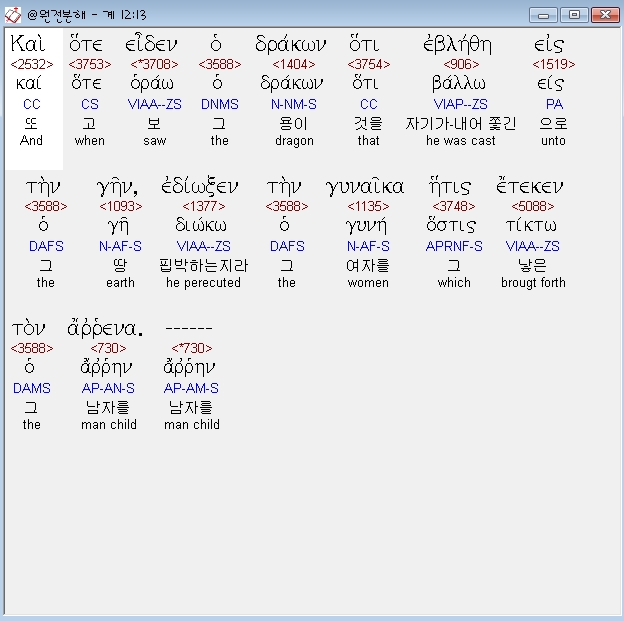 헬라어신약Stephanos,13 και οτε ειδεν ο δρακων οτι εβληθη εις την γην εδιωξεν την γυναικα ητις ετεκεν τον αρρενα