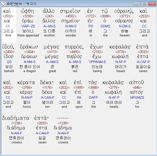 헬라어신약Stephanos,3 και ωφθη αλλο σημειον εν τω ουρανω και ιδου δρακων μεγας πυρρος εχων κεφαλας επτα και κερατα δεκα και επι τας κεφαλας αυτου διαδηματα επτα