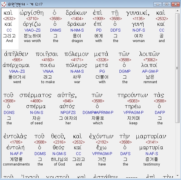 헬라어신약Stephanos,17 και ωργισθη ο δρακων επι τη γυναικι και απηλθεν ποιησαι πολεμον μετα των λοιπων του σπερματος αυτης των τηρουντων τας εντολας του θεου και εχοντων την μαρτυριαν του ιησου χριστου