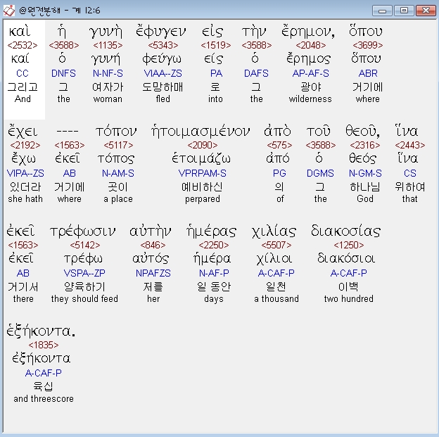 헬라어신약Stephanos,6 και η γυνη εφυγεν εις την ερημον οπου εχει τοπον ητοιμασμενον απο του θεου ινα εκει τρεφωσιν αυτην ημερας χιλιας διακοσιας εξηκοντα