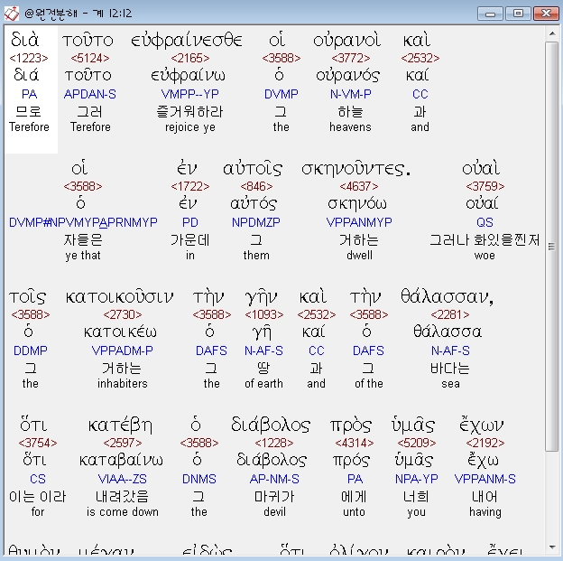 헬라어신약Stephanos,12 δια τουτο ευφραινεσθε οι ουρανοι και οι εν αυτοις σκηνουντες ουαι τοις κατοικουσιν την γην και την θαλασσαν οτι κατεβη ο διαβολος προς υμας εχων θυμον μεγαν ειδως οτι ολιγον καιρον εχει