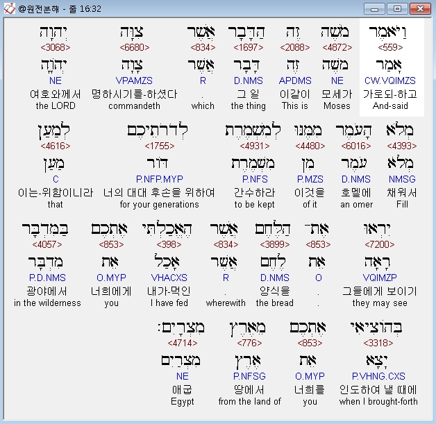 히브리어구약BHS,32 וַיֹּאמֶר מֹשֶׁה זֶה הַדָּבָר אֲשֶׁר צִוָּה יְהוָה מְלֹא הָעֹמֶר מִמֶּנּוּ לְמִשְׁמֶרֶת לְדֹרֹתֵיכֶם לְמַעַן יִרְאוּ אֶת־הַלֶּחֶם אֲשֶׁר הֶאֱכַלְתִּי אֶתְכֶם בַּמִּדְבָּר בְּהֹוצִיאִי אֶתְכֶם מֵאֶרֶץ מִצְרָיִם׃