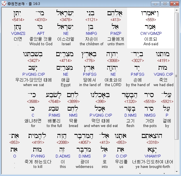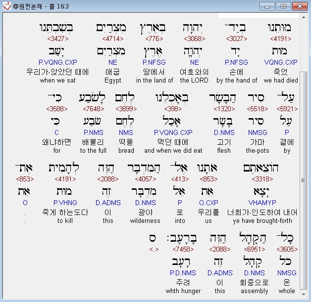 히브리어구약BHS,3 וַיֹּאמְרוּ אֲלֵהֶם בְּנֵי יִשְׂרָאֵל מִי־יִתֵּן מוּתֵנוּ בְיַד־יְהוָה בְּאֶרֶץ מִצְרַיִם בְּשִׁבְתֵּנוּ עַל־סִיר הַבָּשָׂר בְּאָכְלֵנוּ לֶחֶם לָשֹׂבַע כִּי־הֹוצֵאתֶם אֹתָנוּ אֶל־הַמִּדְבָּר הַזֶּה לְהָמִית אֶת־כָּל־הַקָּהָל הַזֶּה בָּרָעָב׃ ס