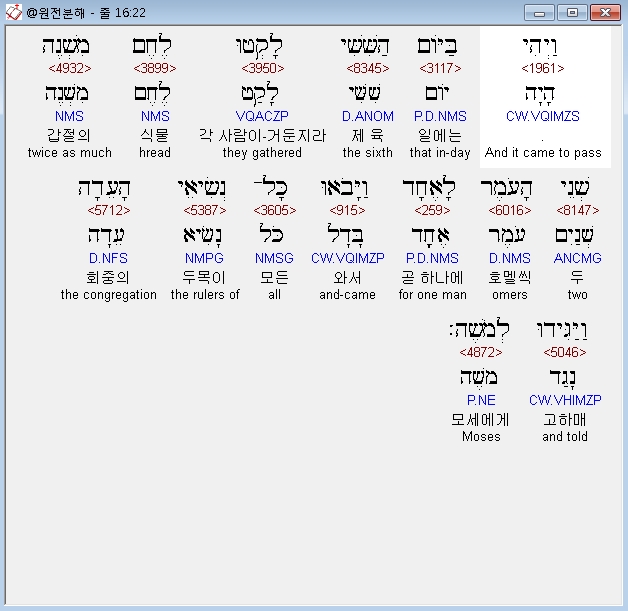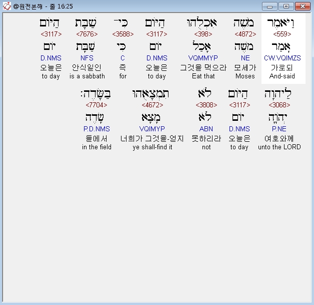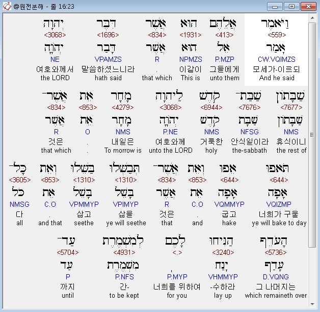 와요멜 아도나이 엘 모쉐 힌니 맘티르 라켐 레헴 민 핫솨마임 웨야차 하암 웨라케투 데발 욤 베요모 레마안 아나세누 하예렠 베토라티 임 로