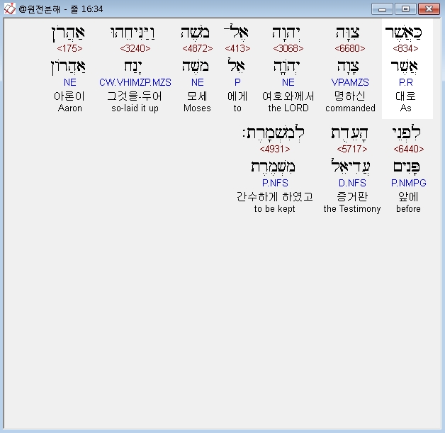 히브리어구약BHS,34 כַּאֲשֶׁר צִוָּה יְהוָה אֶל־מֹשֶׁה וַיַּנִּיחֵהוּ אַהֲרֹן לִפְנֵי הָעֵדֻת לְמִשְׁמָרֶת׃