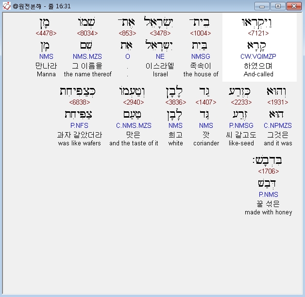 영어NASB,31 And the house of Israel named it manna, and it was like coriander seed, white; and its taste was like wafers with honey.