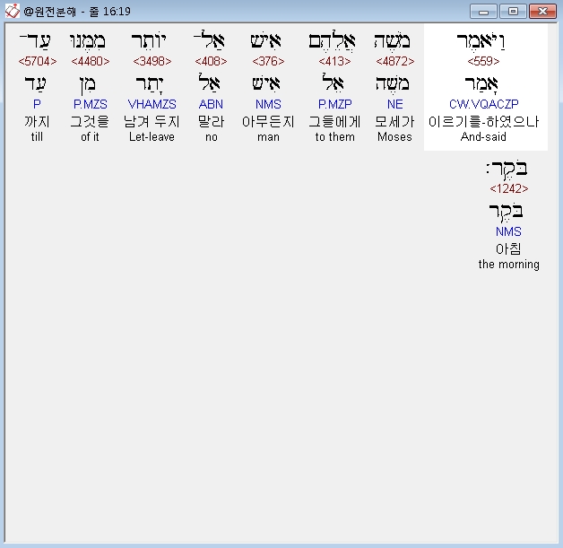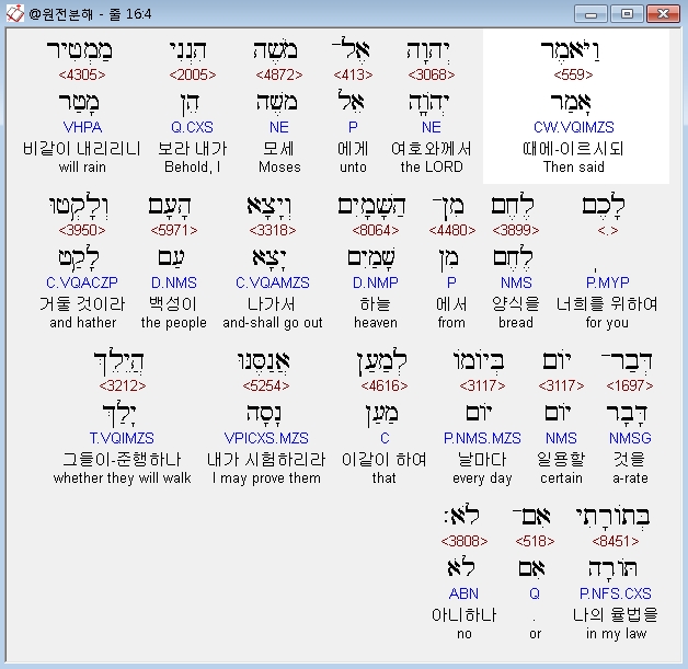 히브리어구약BHS,4 וַיֹּאמֶר יְהוָה אֶל־מֹשֶׁה הִנְנִי מַמְטִיר לָכֶם לֶחֶם מִן־הַשָּׁמָיִם וְיָצָא הָעָם וְלָקְטוּ דְּבַר־יֹום בְּיֹומֹו לְמַעַן אֲנַסֶּנּוּ הֲיֵלֵךְ בְּתֹורָתִי אִם־לֹא׃