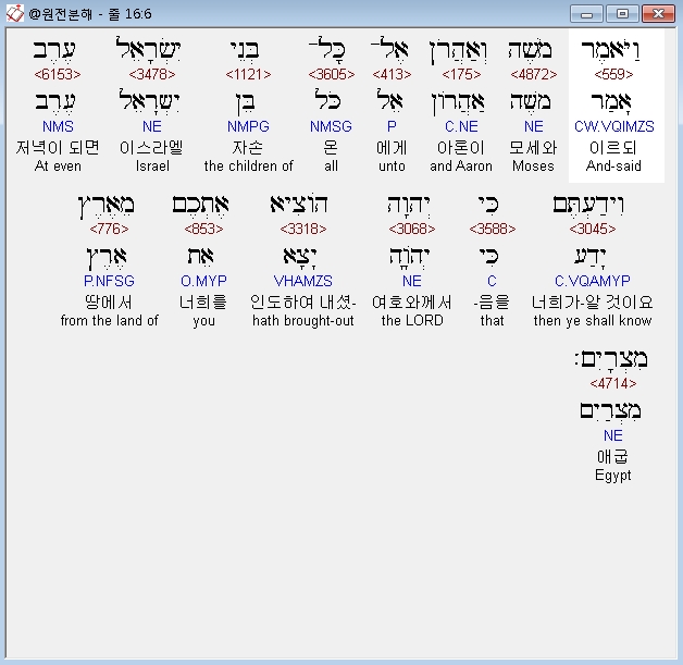 히브리어구약BHS,6 וַיֹּאמֶר מֹשֶׁה וְאַהֲרֹן אֶל־כָּל־בְּנֵי יִשְׂרָאֵל עֶרֶב וִידַעְתֶּם כִּי יְהוָה הֹוצִיא אֶתְכֶם מֵאֶרֶץ מִצְרָיִם׃