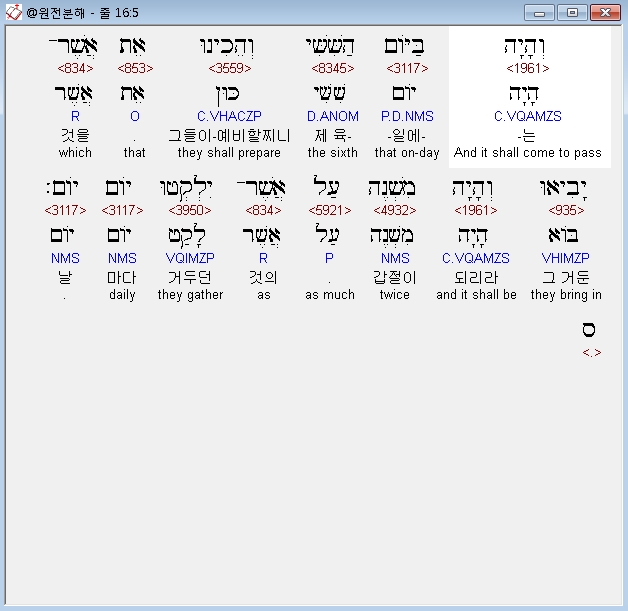 히브리어구약BHS,5 וְהָיָה בַּיֹּום הַשִּׁשִּׁי וְהֵכִינוּ אֵת אֲשֶׁר־יָבִיאוּ וְהָיָה מִשְׁנֶה עַל אֲשֶׁר־יִלְקְטוּ יֹום יֹום׃ ס