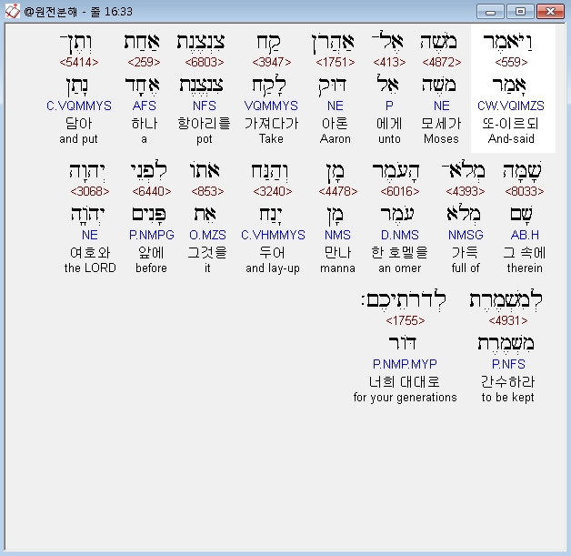 히브리어구약BHS,33 וַיֹּאמֶר מֹשֶׁה אֶל־אַהֲרֹן קַח צִנְצֶנֶת אַחַת וְתֶן־שָׁמָּה מְלֹא־הָעֹמֶר מָן וְהַנַּח אֹתֹו לִפְנֵי יְהוָה לְמִשְׁמֶרֶת לְדֹרֹתֵיכֶם׃