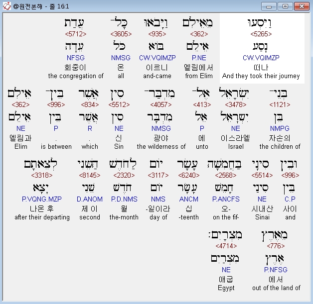 영어NRSV,1 The whole congregation of the Israelites set out from Elim; and Israel came to the wilderness of Sin, which is between Elim and Sinai, on the fifteenth day of the second month after they had departed from the land of Egypt.