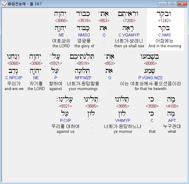 영어NASB,7 and in the morning you will see the glory of the LORD, for He hears your grumblings against the LORD; and what are we, that you grumble against us? "